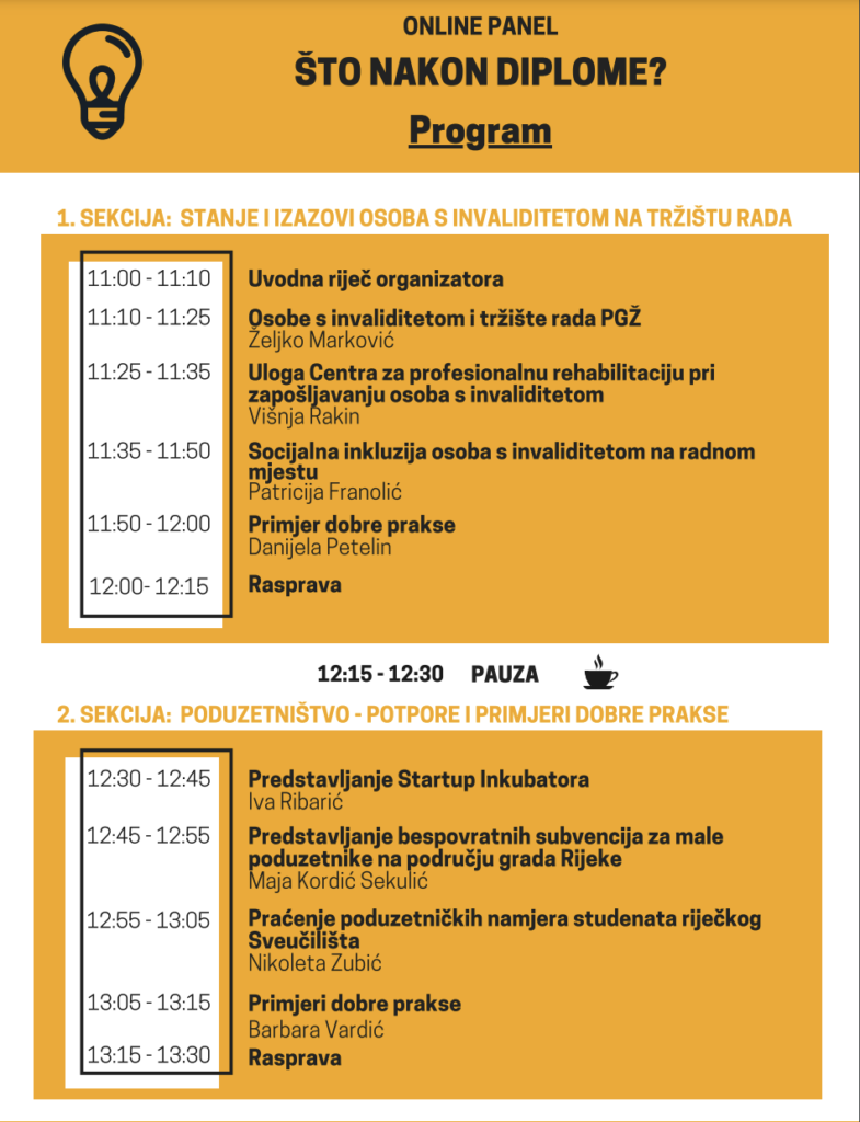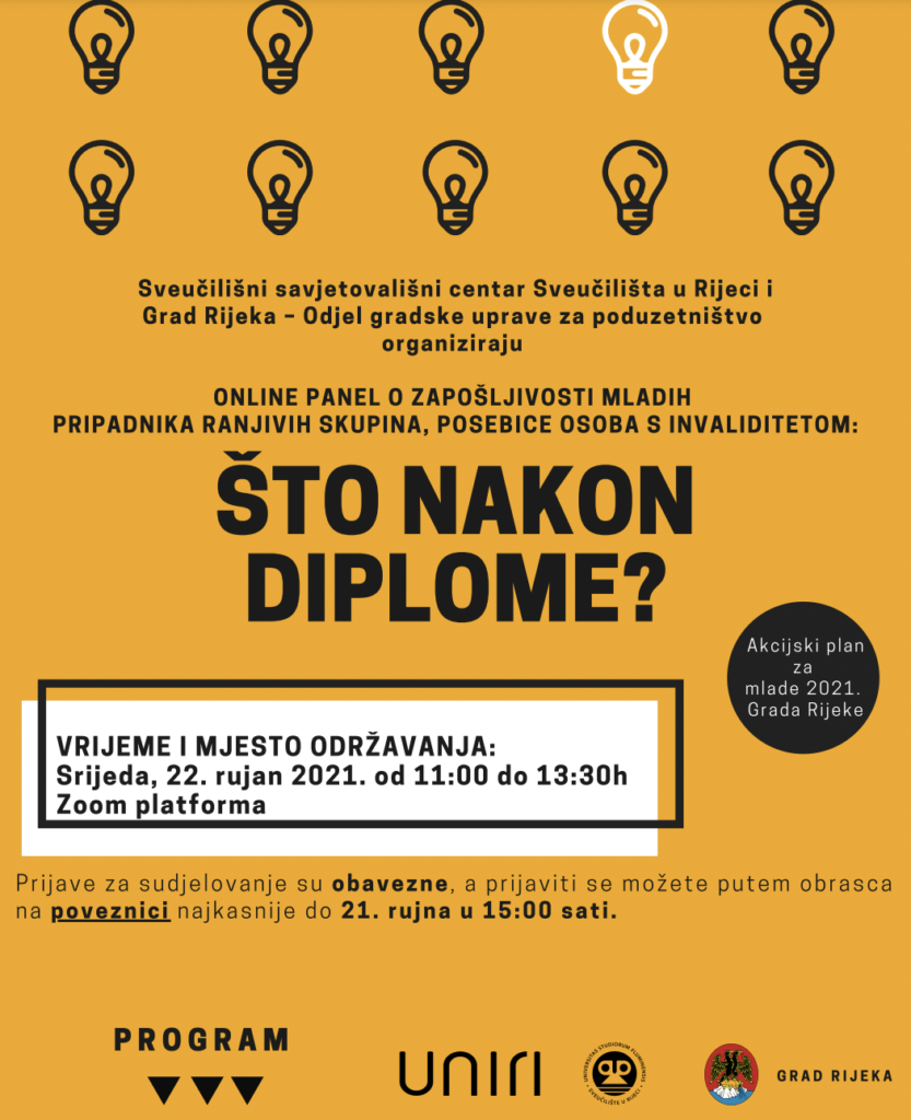 Odjel za poduzetništvo Grada Rijeke, u suradnji sa Sveučilišnim savjetovališnim centrom, organiziraju online događaj pod nazivom ‘Što nakon diplome?’ s krovnom temom ‘Zapošljivost mladih’, namijenjen ranjivim skupinama, a posebice osobama s invaliditetom.