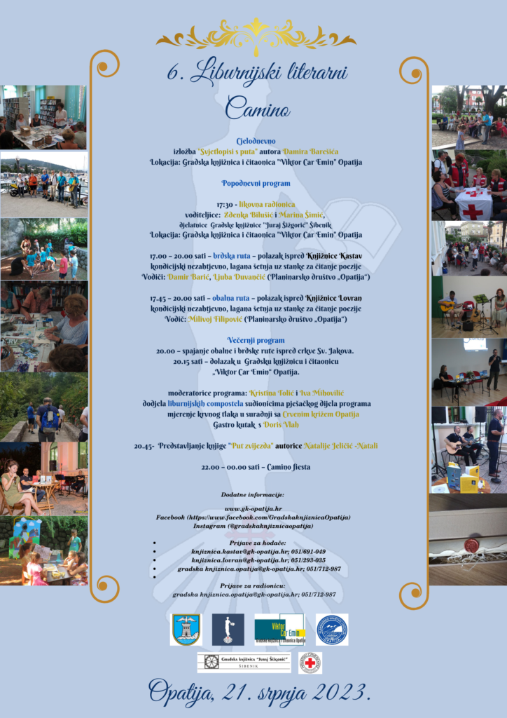 Iz Gradske knjižnice Opatija stiže poziv na 6. tradicionalnu srpanjsku literarno-gastronomsko-glazbeno-rekreacijsku manifestaciju “Liburnijski literarni Camino” koju organizira povodom proslave Dana grada Opatije, a kojom spaja umjetnost, književnost, glazbu, rekreaciju i gastronomiju u jednu jedinstvenu cjelinu i predstavlja specifičan iskustveni doživljaj za sve posjetitelje.